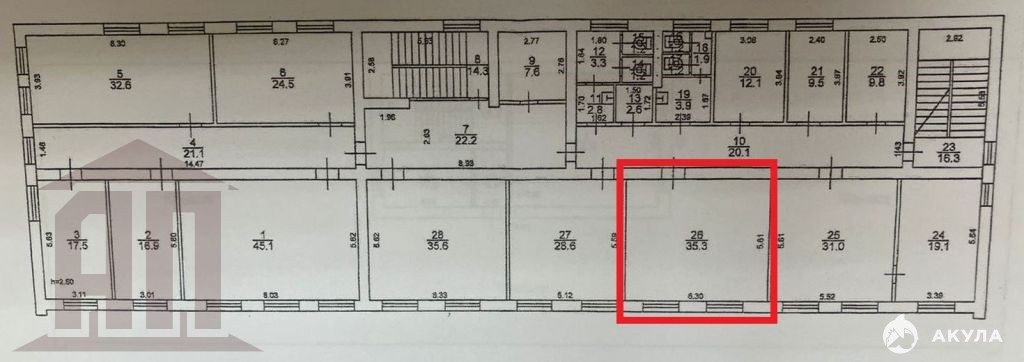 Сдается офисное помещение 35, 3 м на третьем этаже административного здания.