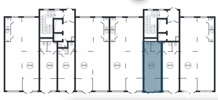 Площади - 27, 37 м2; 28, 02 м2; 29, 56 м2; 30, 74 м2; 31, 66 м2; 32, 27 м2; 34, 1 м2; 69 м2; 95, 96 м2; 95, 42 м2; 118, 7 м2; 125, 4 м2.