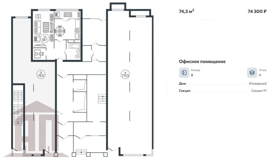 Стоимость аренды 74 300 рублей в месяц.