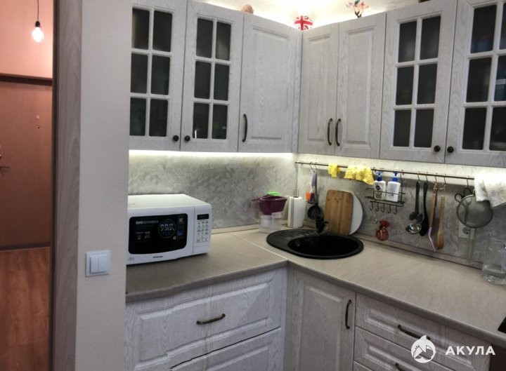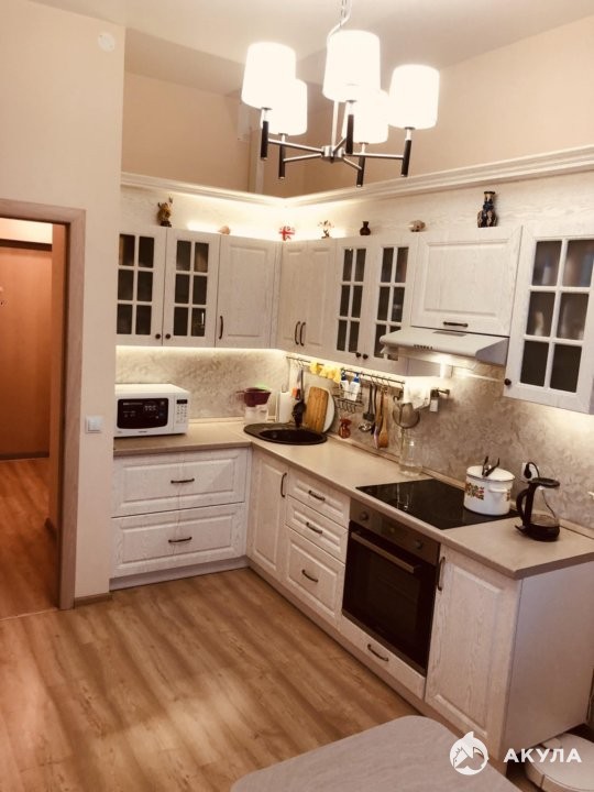Полностью оборудованная кухня: холодильник, плита с 4 конфорками, духовка, микроволновка, электрический чайник, небольшой набор посуды.