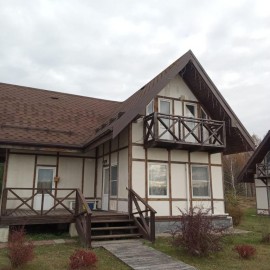 Двухэтажный кирпичный дом 11.2х10.8м без внутренней отделки с цокольным этажом и мансардой. Общая площадь 194 кв.м. Встроенный гараж 20 кв.м. с автоматическими секционными воротами. Окна - стеклопакеты, крыша - металлочерепица. Фундамент сборный ж/бетон. Цоколь силикатный...