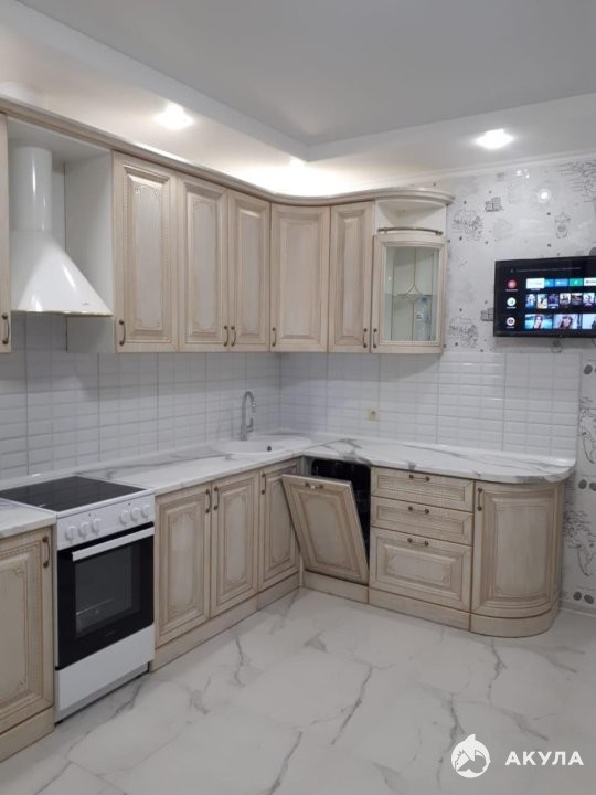 Полностью оборудованная кухня: холодильник, плита с 4 конфорками, духовка, микроволновка, электрический чайник, небольшой набор посуды.