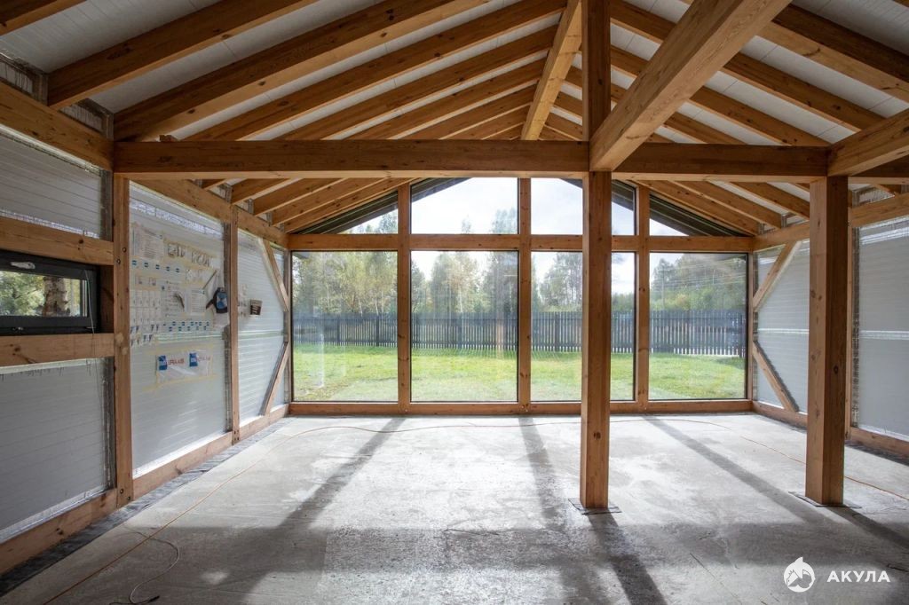 В основе дома опорно-балочная система из клееного бруса, изготовленная на станках ЧПУ (компании Нundеggеr, Германия). Ламели бруса склеены безопасным составом (компании Аkzо Nоbеl, Голландия).