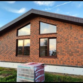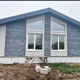 Строительство дома 63 кв.м. Фундамент-плита 300, стены 375 газосиликатный блок, облицовка керамический кирпич, перегородки силикатный кирпич, крыша металлочерепица с утеплением. Высота потолков 5 м, панорамные окна, большая кухня-гостиная 27, 8 м, две спальни,...