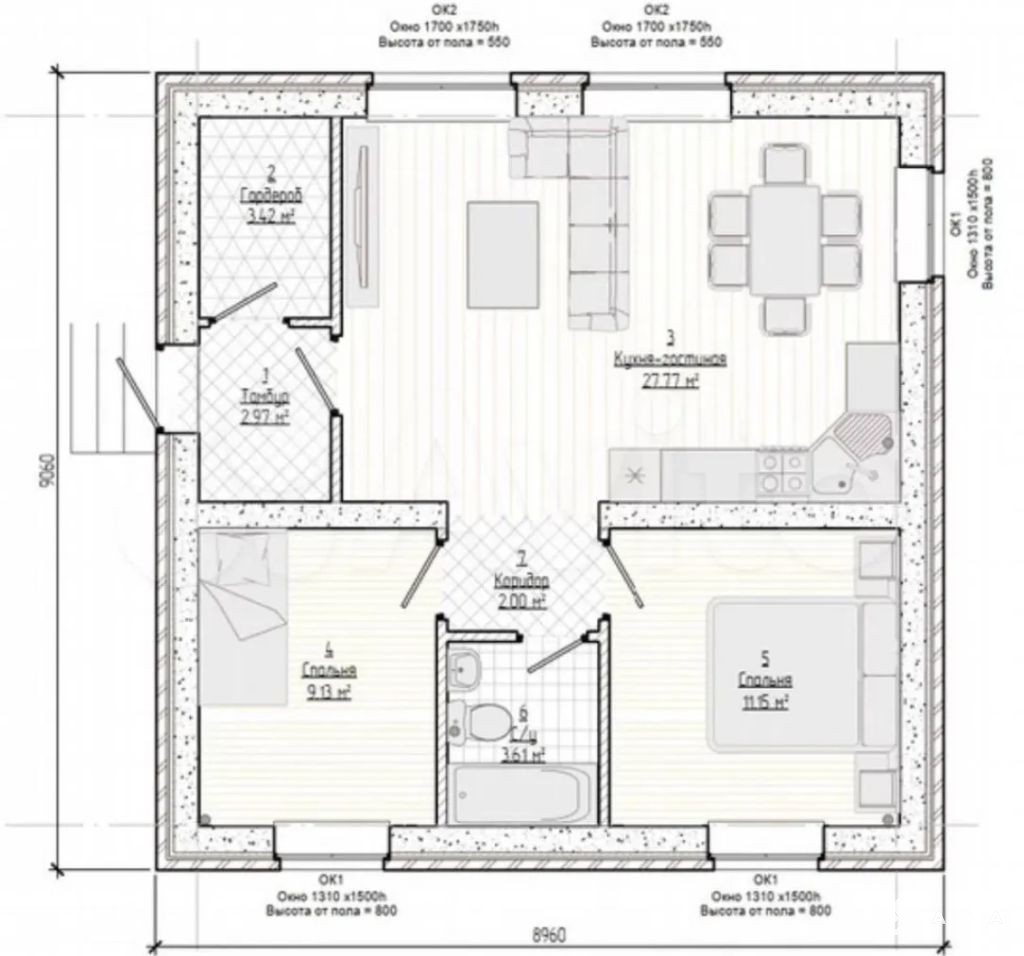 Высота потолков 5 м, панорамные окна, большая кухня-гостиная 27, 8 м, две спальни, гардеробная.
