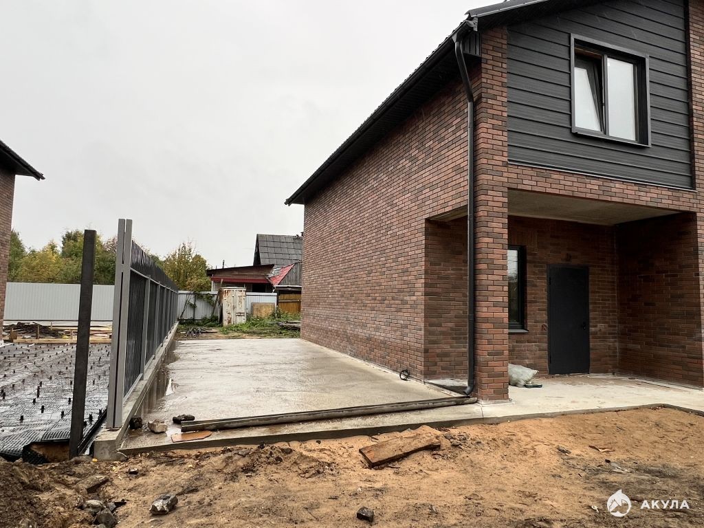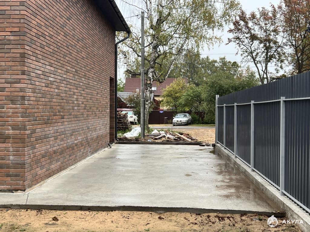 Участок огорожен с 3 сторон. Залита зона парковки, отмостка.
