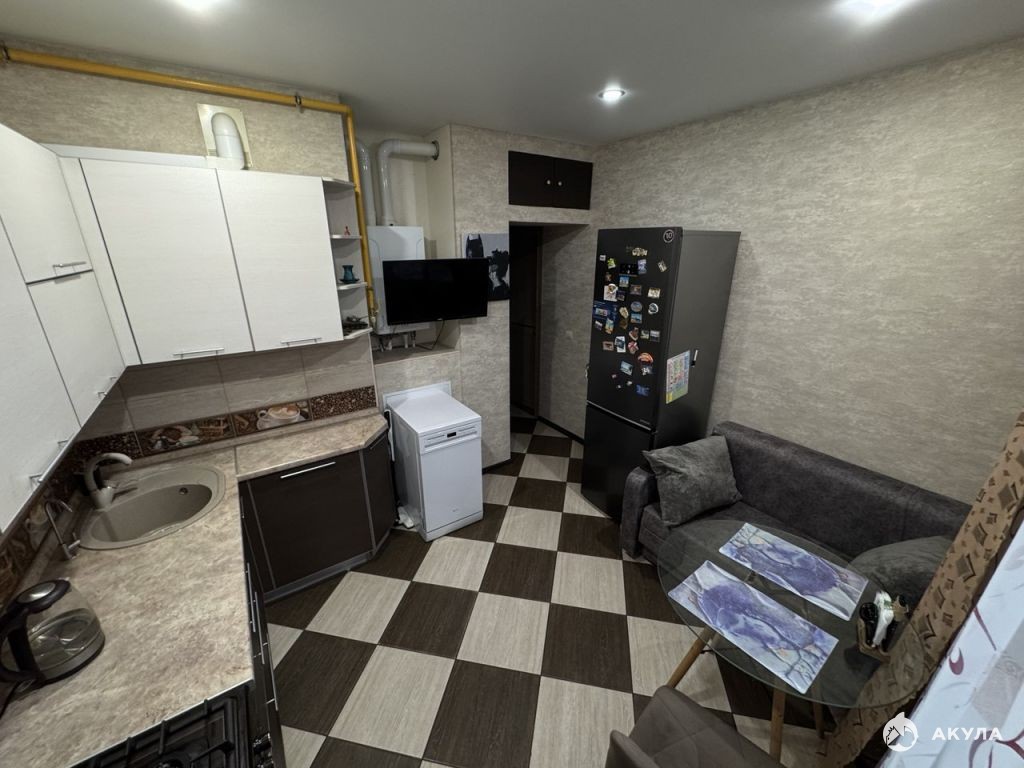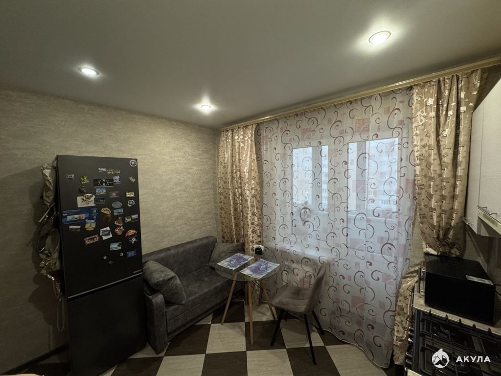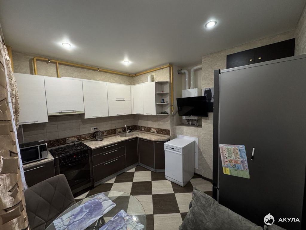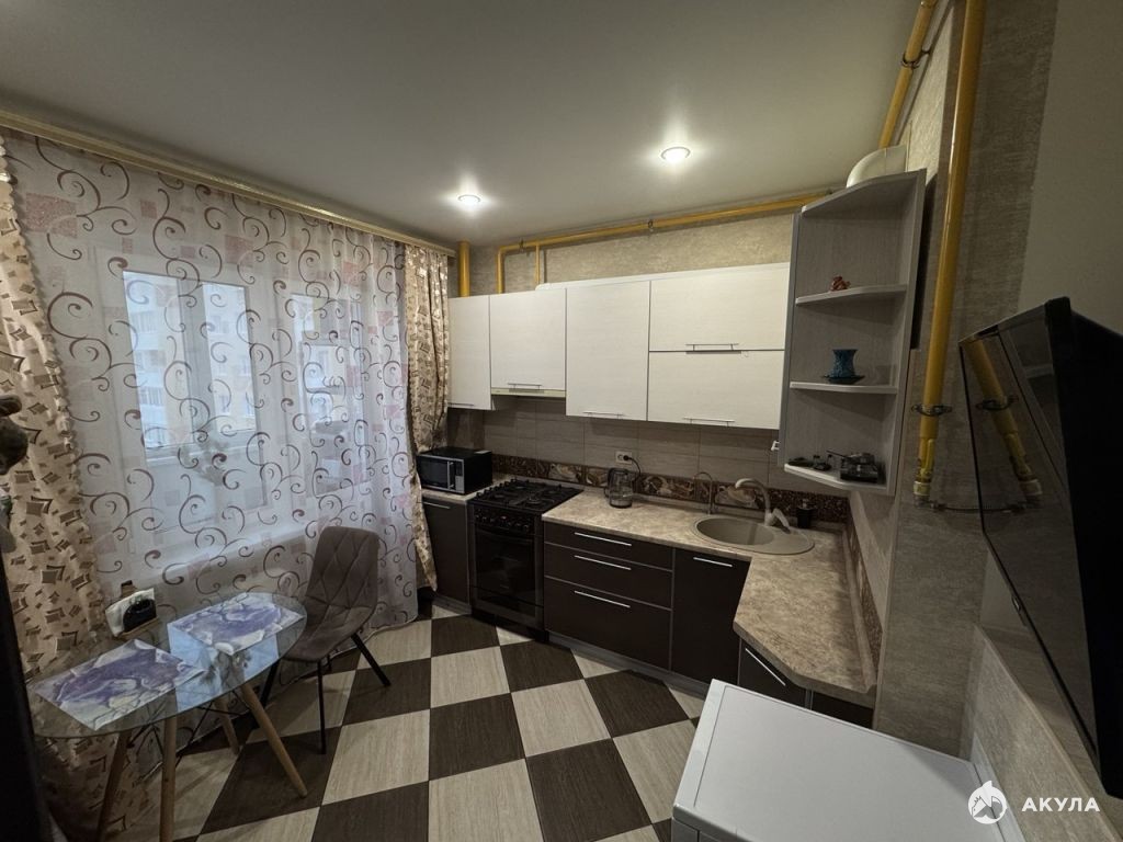 В квартире выполнен хороший ремонт, все фото реальные. Натяжные потолки по всей квартире. Плитка на кухне, в коридоре и санузле; в комнате ламинат. Есть кондиционер, установлен в 2024 году. Кухонный гарнитур остаётся вместе с вытяжкой и стиральной машиной. Большой встроенный шкаф-купе, кондиционер. Остальная мебель по договоренности.