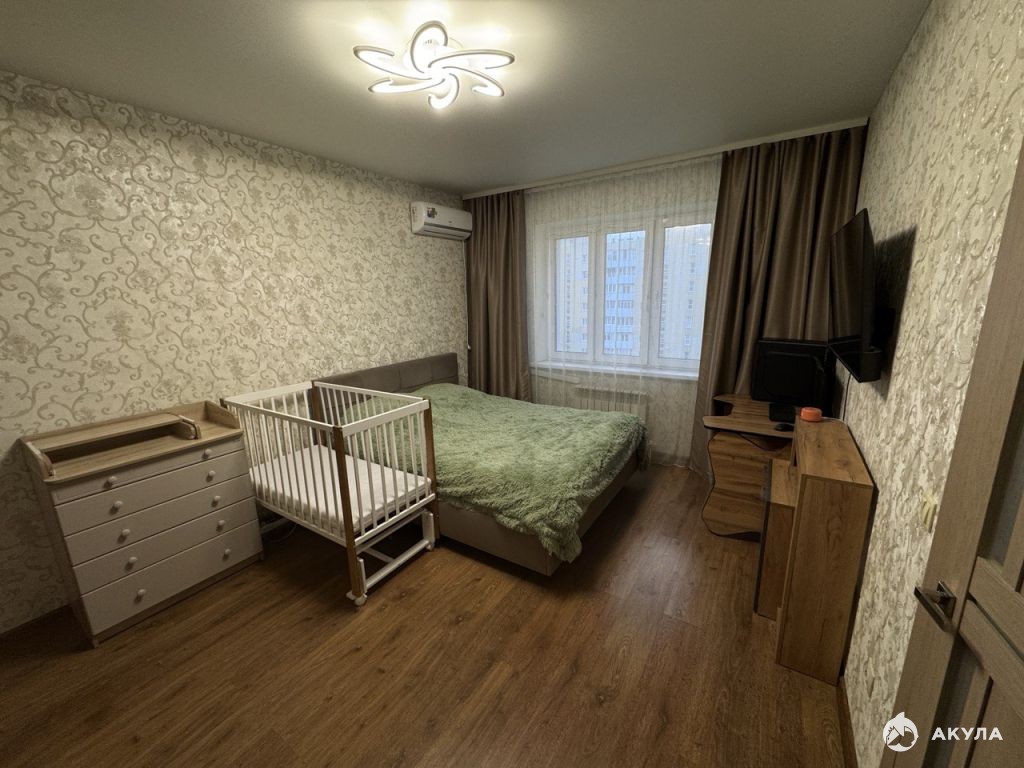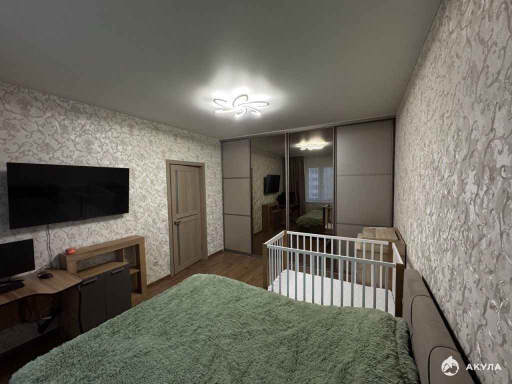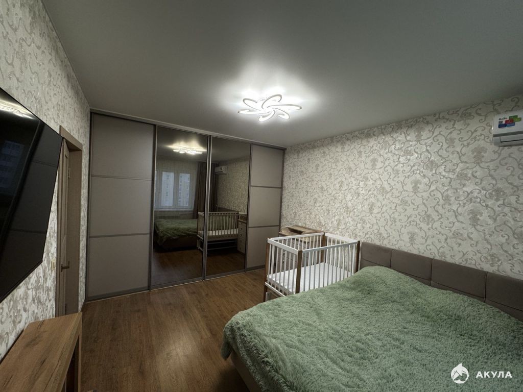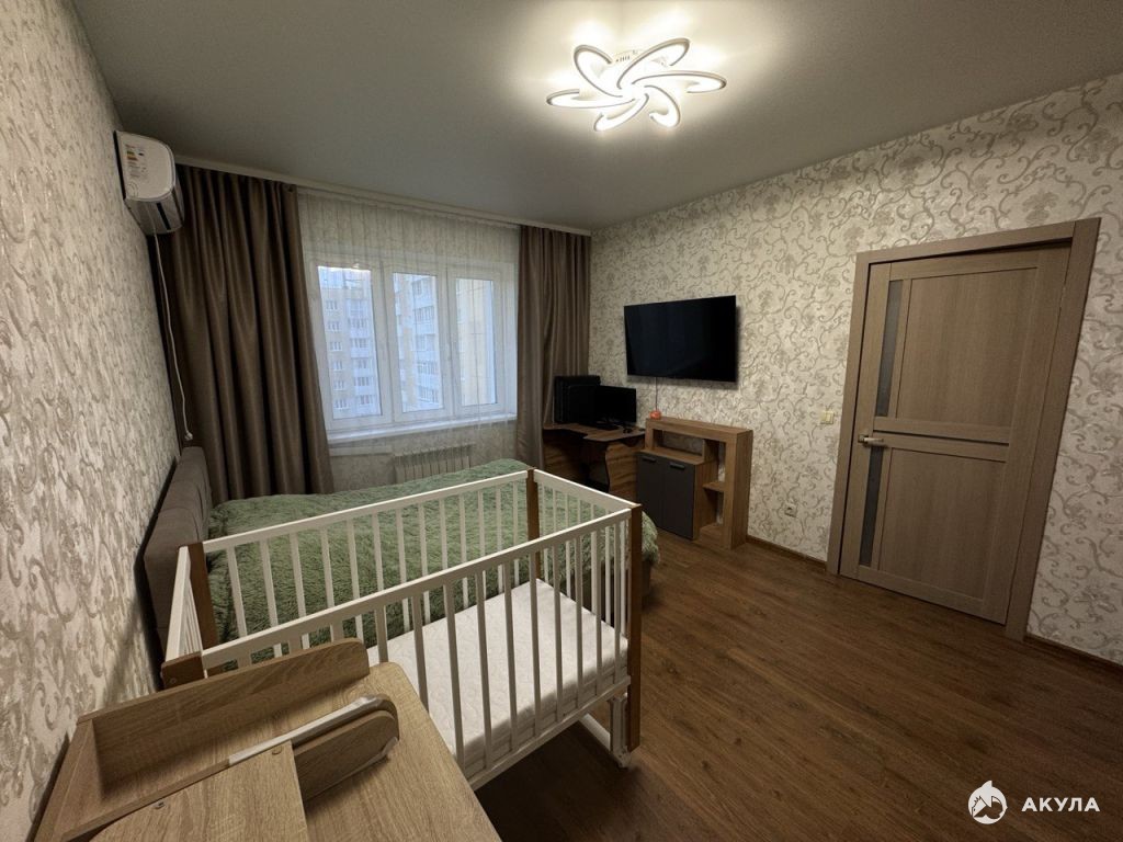 В квартире выполнен хороший ремонт, все фото реальные. Натяжные потолки по всей квартире. Плитка на кухне, в коридоре и санузле; в комнате ламинат. Есть кондиционер, установлен в 2024 году. Кухонный гарнитур остаётся вместе с вытяжкой и стиральной машиной. Большой встроенный шкаф-купе, кондиционер. Остальная мебель по договоренности.