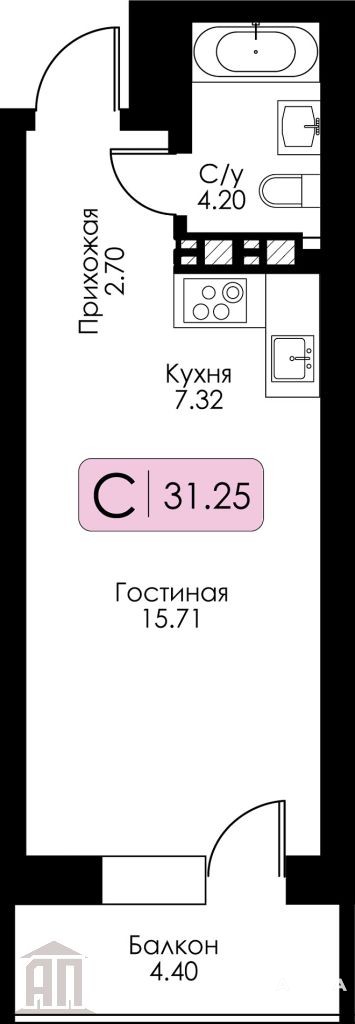 Общая площадь 31 м, ЗОНЫ: комната 15, 7м кухня 7, 3 м, санузел совмещенный 4, 2м, балкон 4, 4 м. Есть возможность сделать ремонт "ПОДКЛЮЧ"