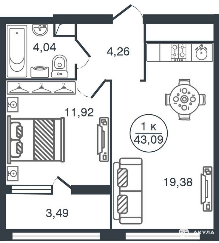 Общая площадь - 43, 9 м2. Большая кухня гостиная - 19, 4м2