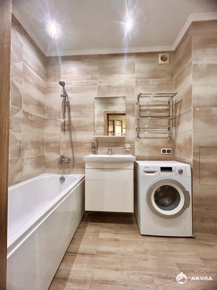 Сан узел совмещённый в кафеле, установлены счётчики на воду.