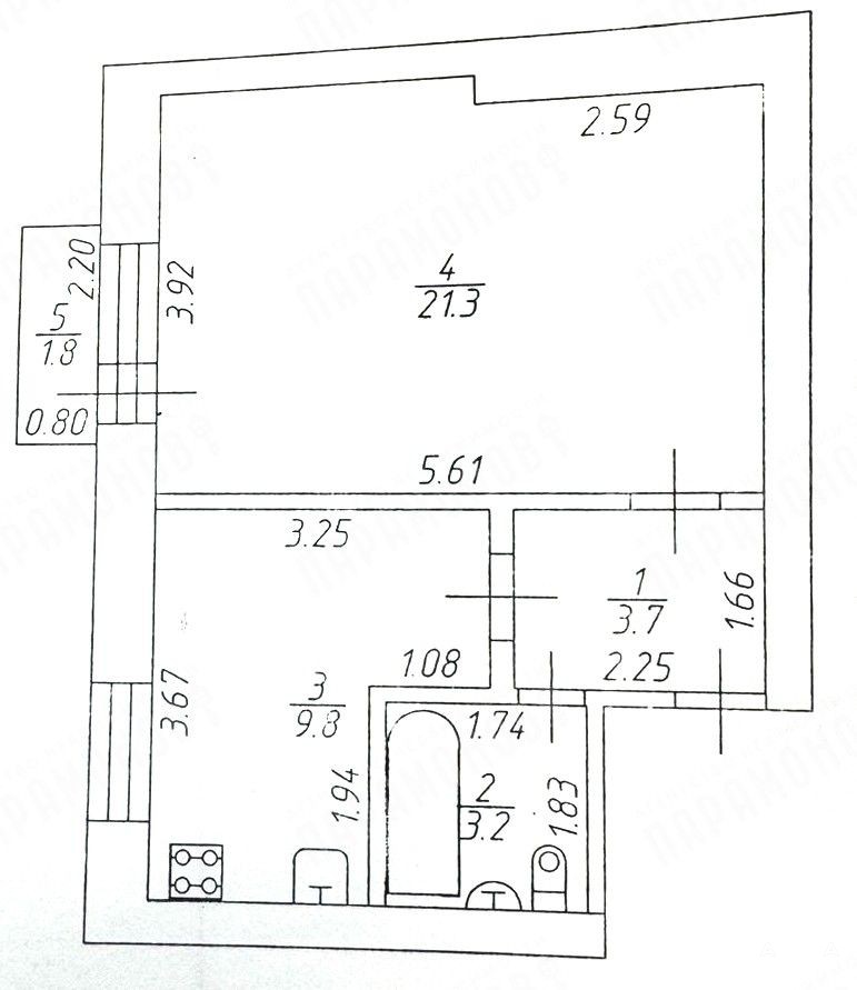 Общая площадь 38 кв.м., большая жилая комната 21, 3 кв.м., кухня 9, 8 кв.м. с выходом на балкон.