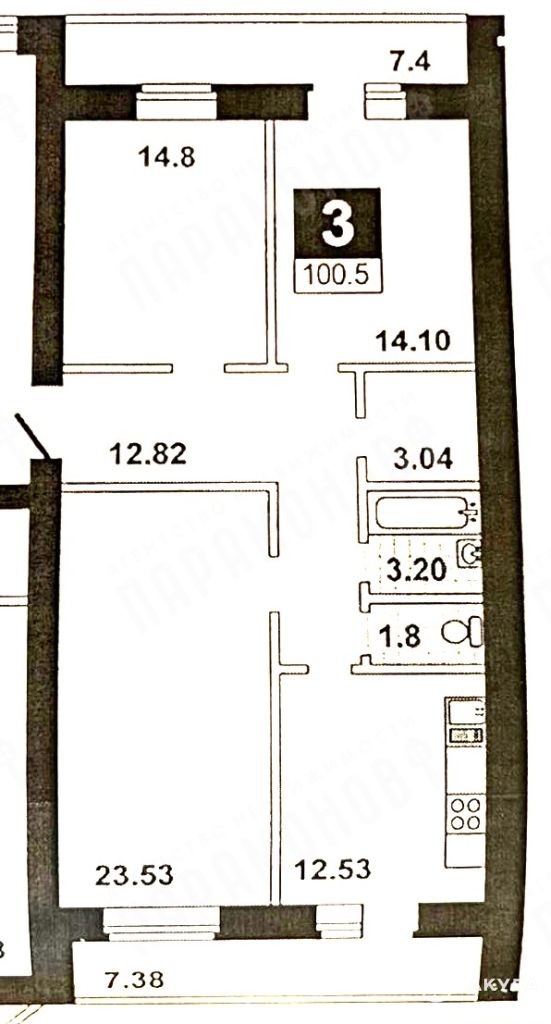 Очень удачная планировка: общая площадь 100, 6 кв.м., по выписке ЕГРН (без холодных помещений) 85, 2 кв.м., две изолированные спальни 14.8 + 14, 1 кв.м., гостиная 23, 53 кв.м., переходящая в кухню столовую 12, 53 кв.м., гардеробная 3, 04 кв.м., просторный совмещенный санузел, из всех помещений есть выходы на утепленные лоджии.Окна квартиры на разные стороны.