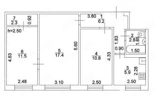 Площадь общая 57, 8 кв.м., комнаты 11, 5+17, 4+10, 8 кв.м., кухня 5, 9 кв.м.