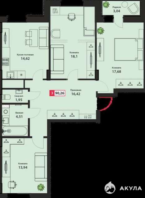 Общая площадь - 90, 2 м2, комнаты - 17, 6м2, 18, 1 м2, 13, 9м2. Кухня гостиная - 14, 6м2.