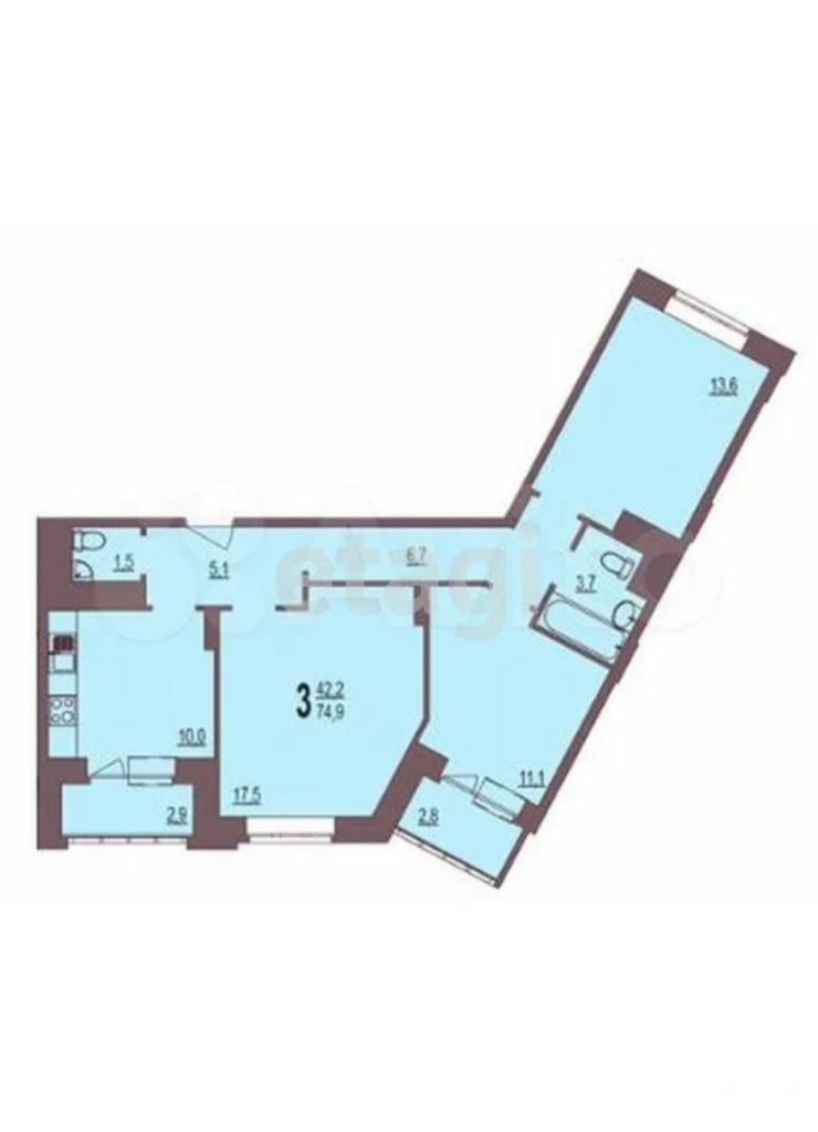На площадке всего 5 квартир. Комнаты 17, 5+13, 6+11, 1 кв.м., кухня 10 кв.м., лоджия из кухни 2, 9 кв.м., вторая лоджия 2, 8 кв.м., застеклены, два сан/узла.
