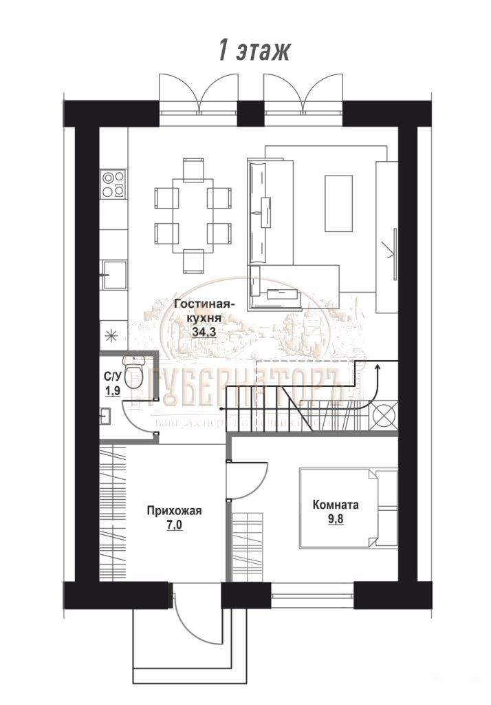 1-й этаж: Просторная прихожая (7 м), уютный кабинет для работы (9.8 м) и настоящая жемчужина дома светлая кухня-гостиная 34.3 м с выходом в свой двор! Здесь вы будете собираться всей семьей.