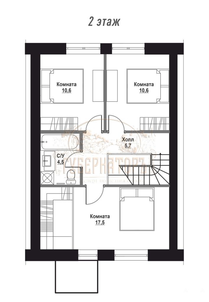 2-й этаж: Целых три светлые спальни (17.5 м, 10.6 м, 10.6 м)! Одна из спален с гардеробной. И современный большой санузел (4.5 м). Места хватит всем!