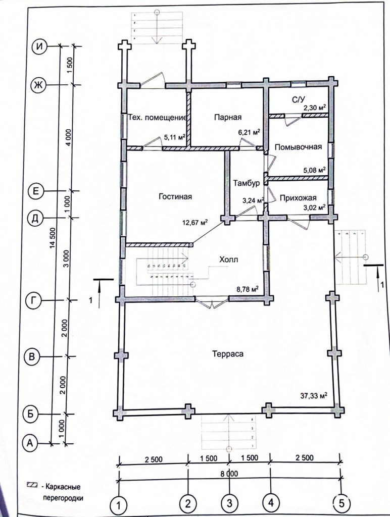 На первом этаже большой холл, кухня-гостиная, сауна, санузел, терраса.