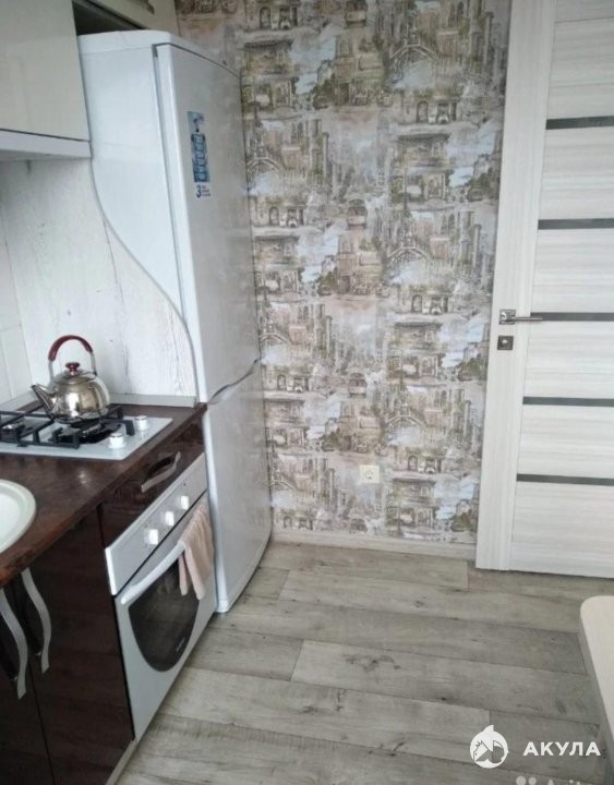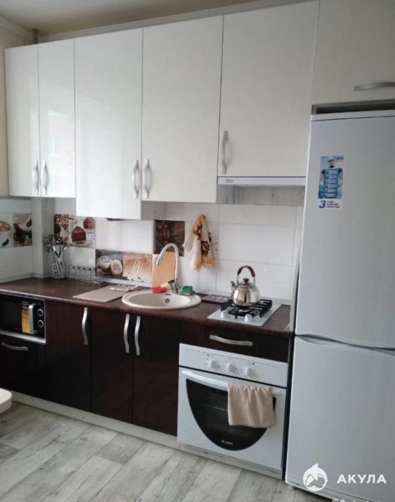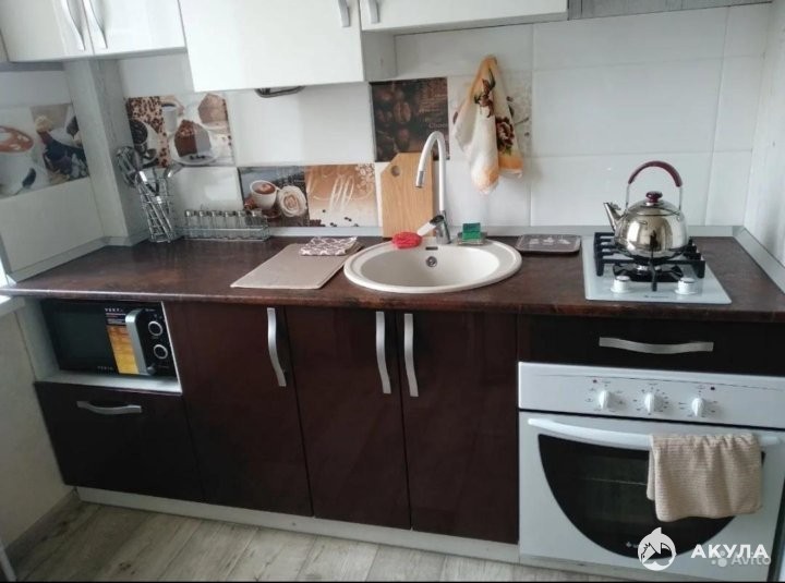 Полностью оборудованная кухня: холодильник, плита с 4 конфорками, духовка, микроволновка, электрический чайник, небольшой набор посуды.